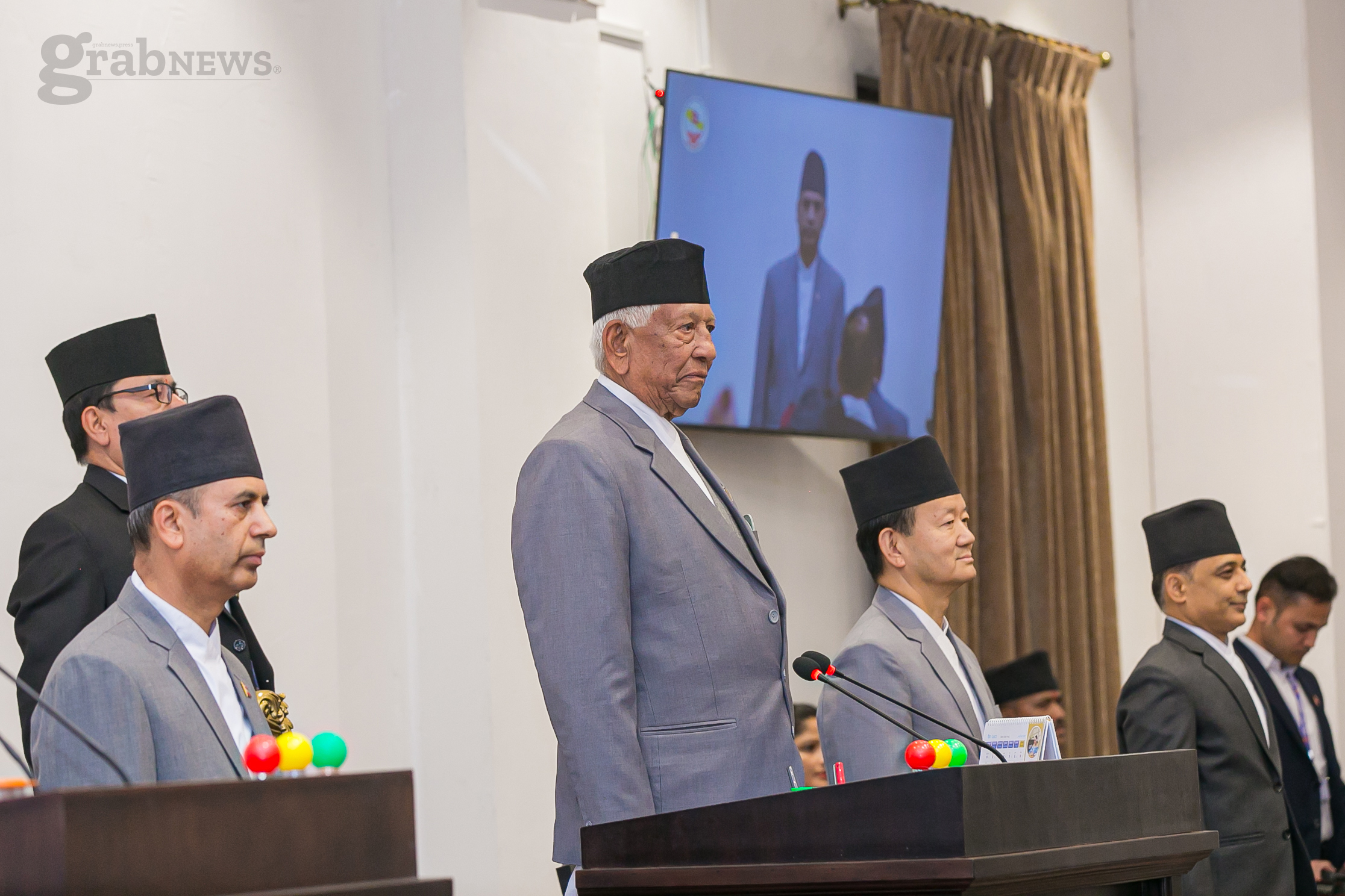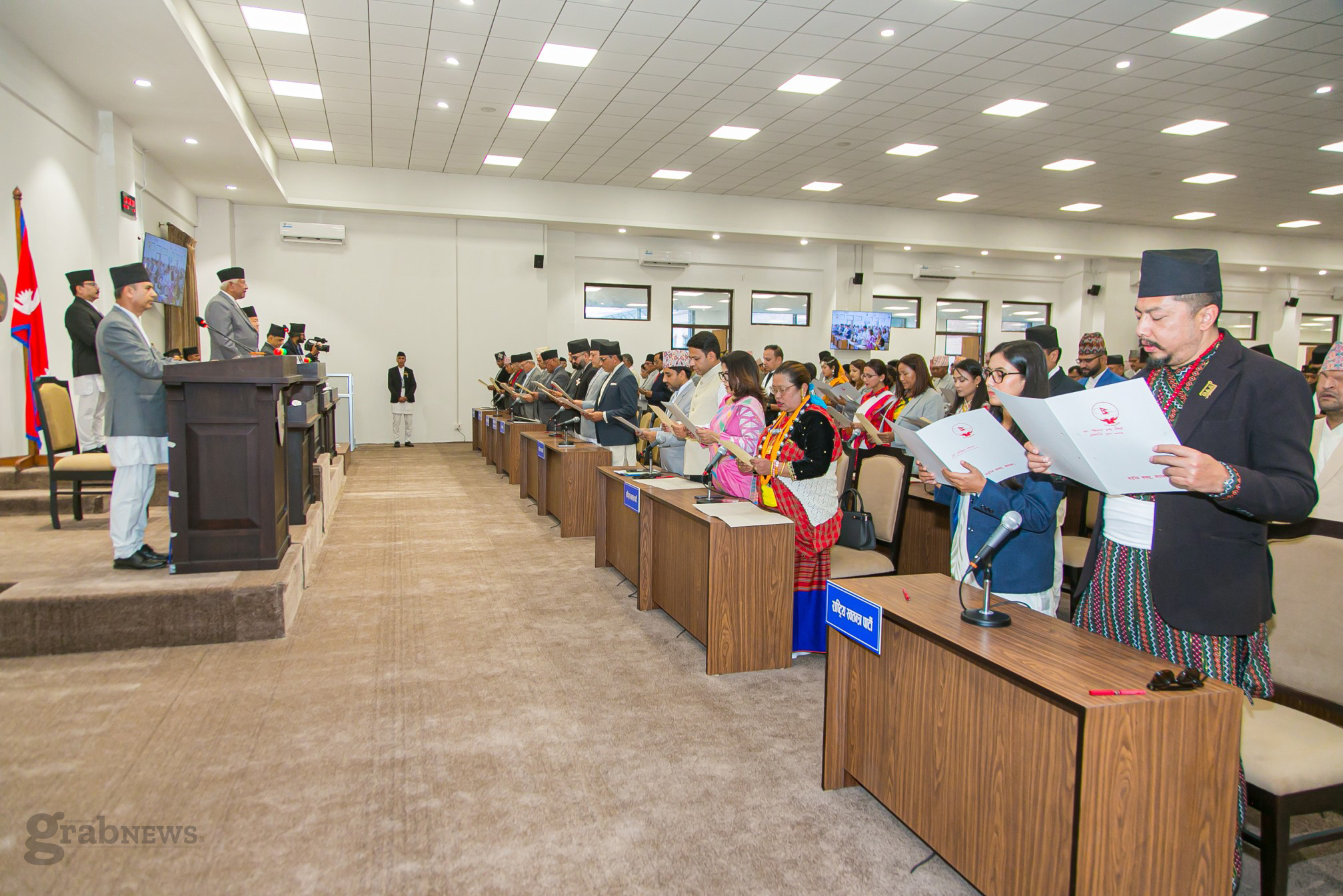 सिंहदरबारस्थित नवनिर्मित संघीय संसद्को अस्थायी रुपमा बनेको बहुउद्देश्यीय हलमा उनीहरुलाई प्रतिनिधिसभाका ज्येष्ठ सदस्य अर्जुननरसिंह केसीले पद तथा गोपनीयताको शपथ गराएका थिए । ज्येष्ठ सदस्य केसीलाई भने राष्ट्रपति रामचन्द्र पौडेलले बुधबार शपथ गराएका थिए ।